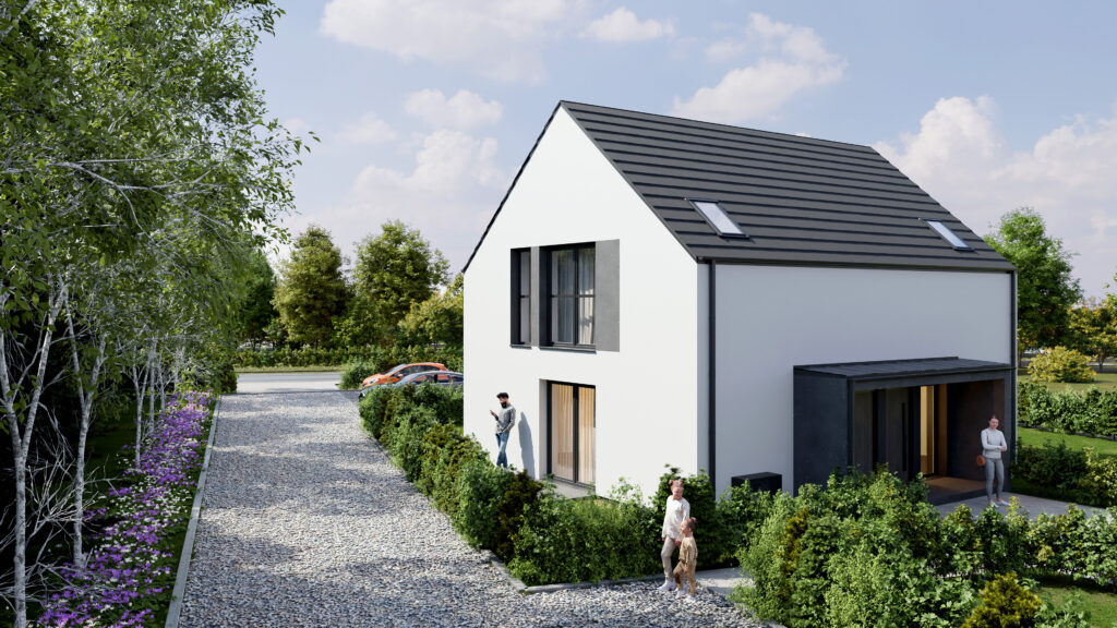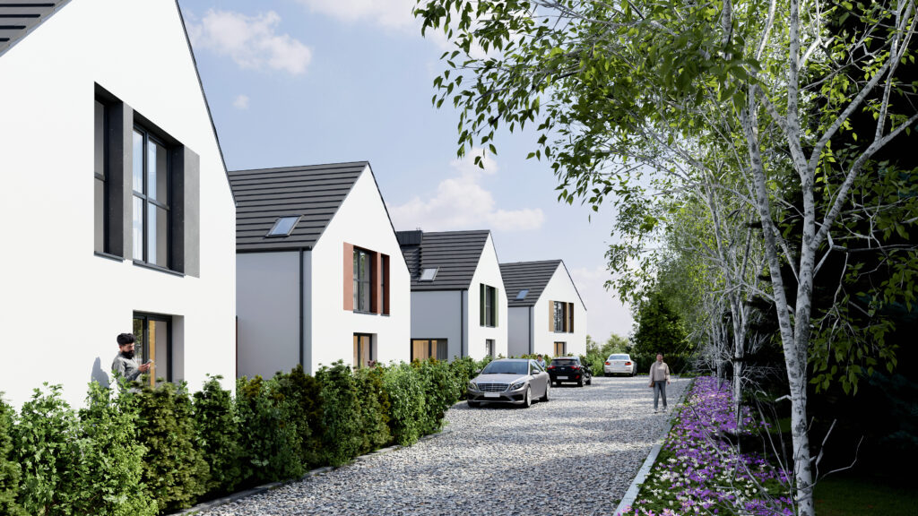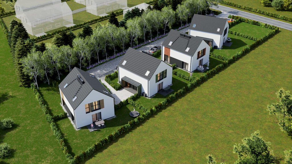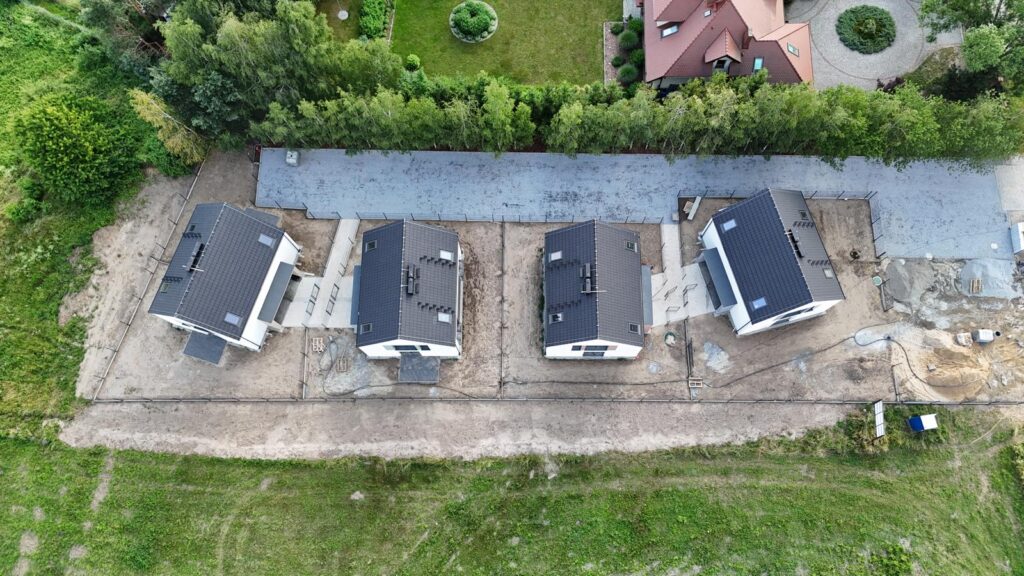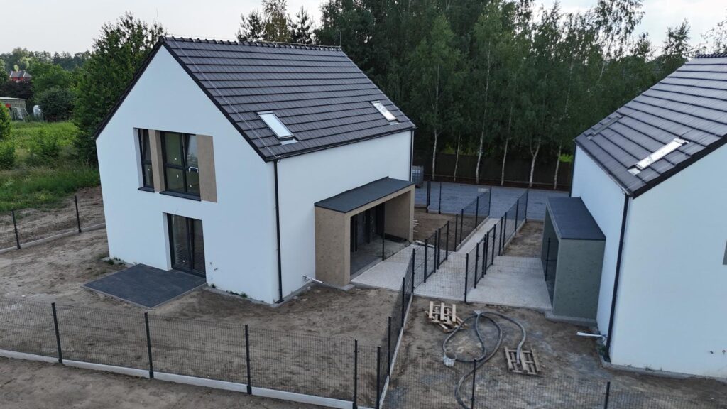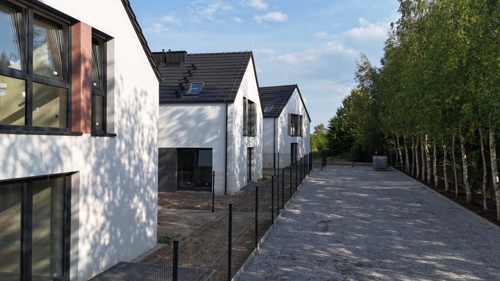 Przedstawiamy naszą kolejną inwestycję na północy Wrocławia. 8 domów w zabudowie bliźniaczej. Wszystkie wyposażone w pompy ciepła. Oddane będą z pełnym zagospodarowaniem – ogrodzone, wybrukowane podjazdy i podejścia.